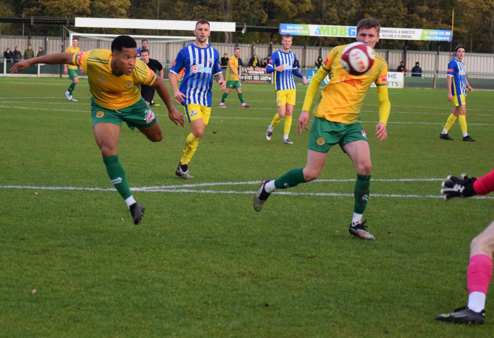 Joe Ferguson scores one of his brace in thr home match against Saturday's opponents. Picture by Neil Thornton.