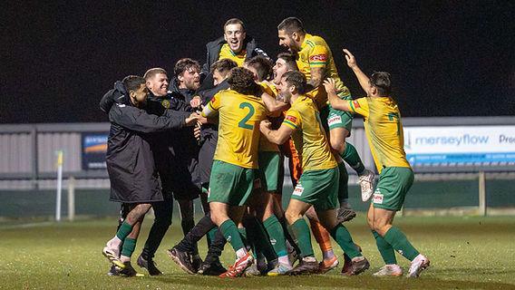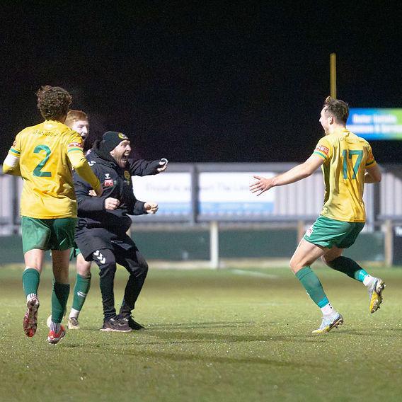 Manager Brad Cooke celebrates with Marcus Cusani (No.17) after his wonder strike in stoppage time. Picture by Peter Gallagher-Headley.
