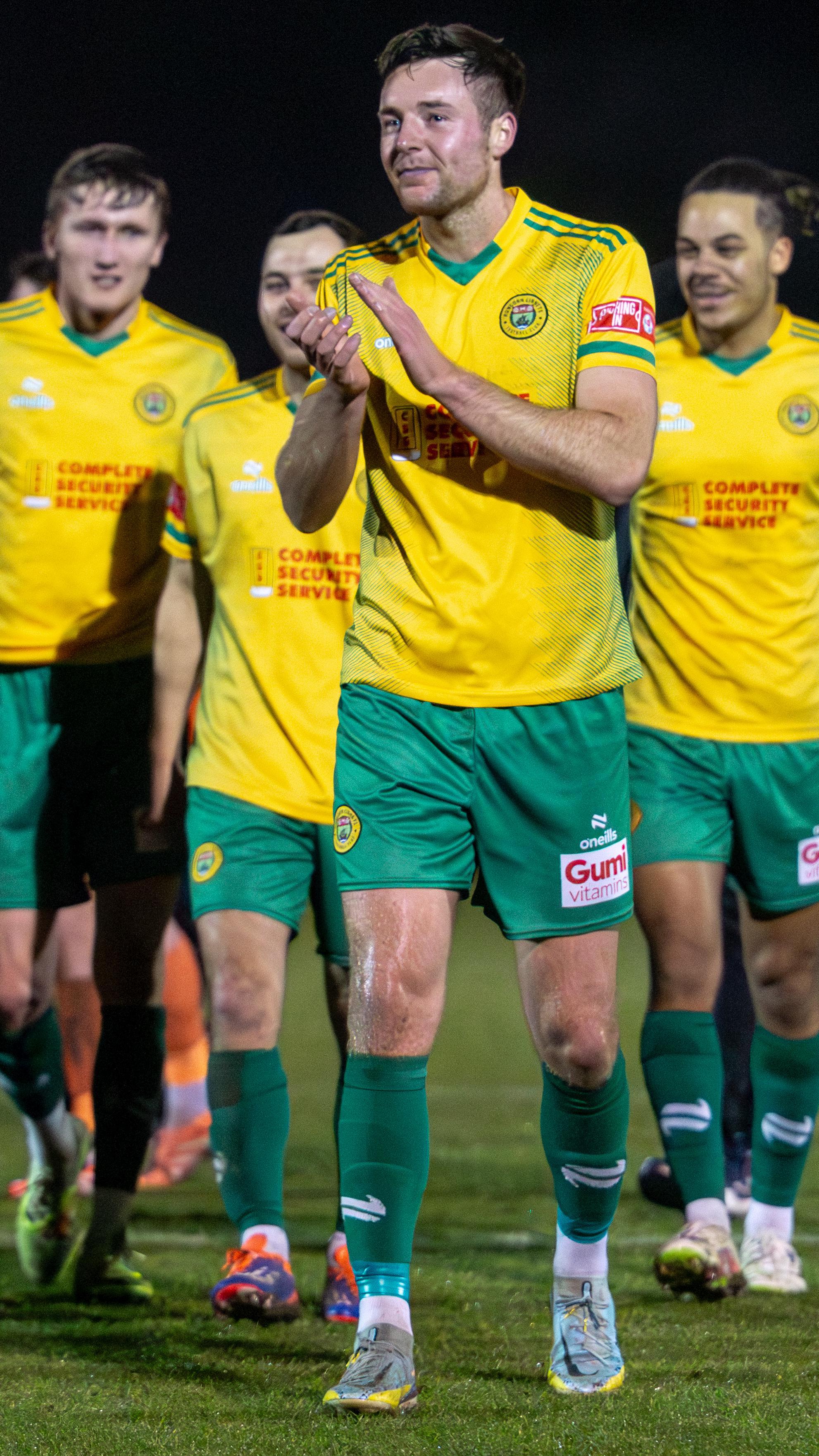 Marcus Cusani leads applause to the fans as he is followed off the field at full-time by Lewis Crane, Matty Rain and Markell Foulds. Picture by Peter Gallagher-Headley