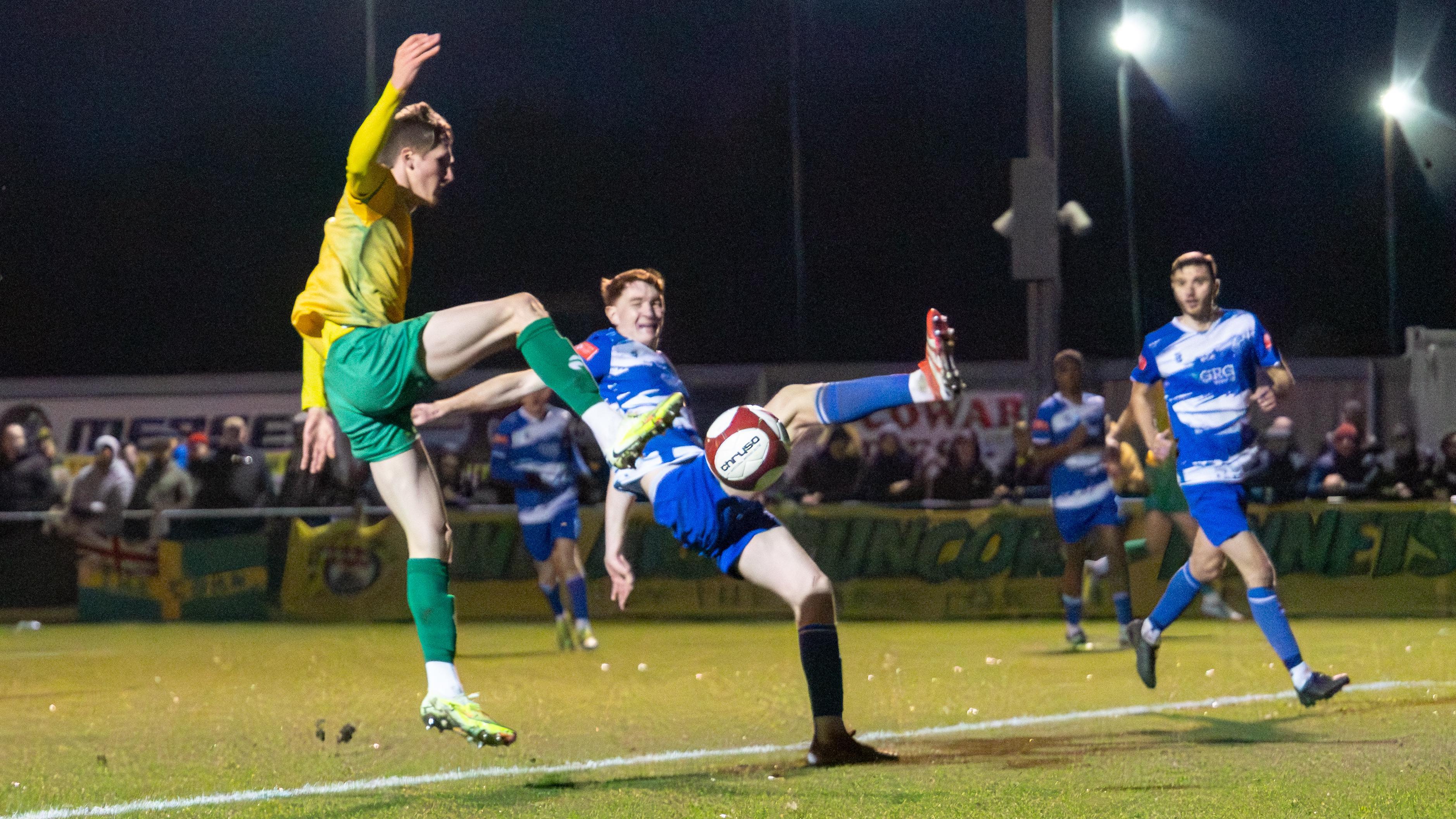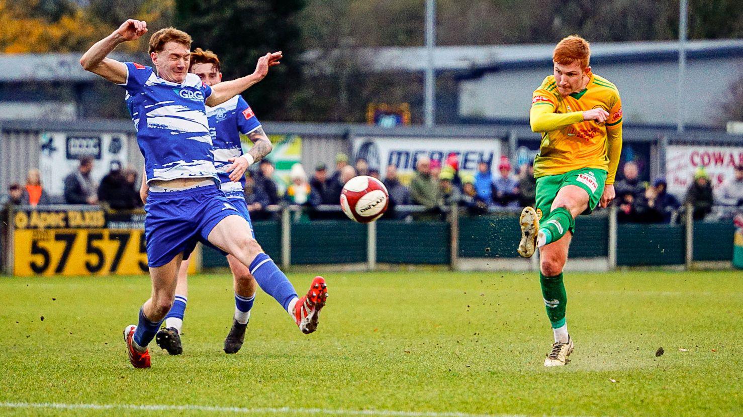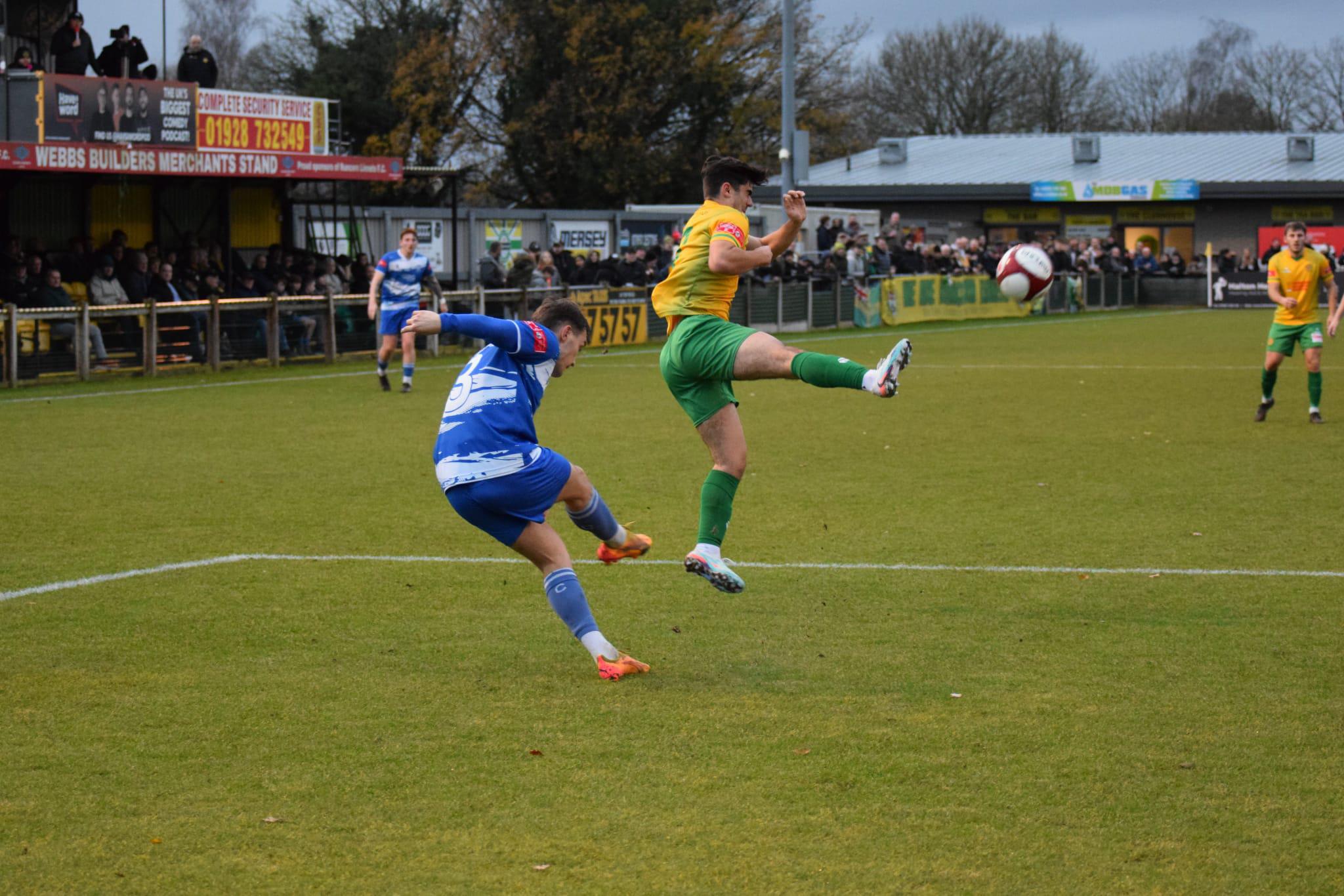 The ball is touched away from Runcorn's third goalscorer Lewis Crane this time. Picture by Peter Gallagher-Headley