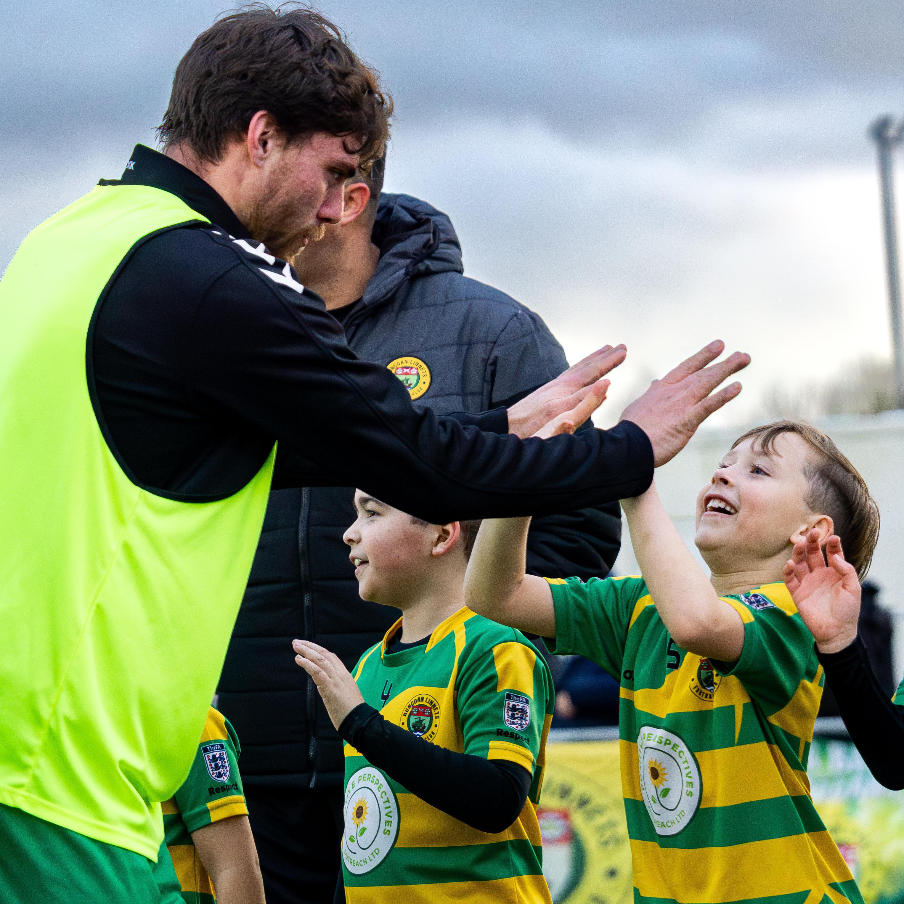 Above: High fives from captain Jacques Welsh for one of our young mascots. Below: Marcus Cusani is smothered in the celebrations which followed his goal. Pictures by Peter Gallagher-Headley
