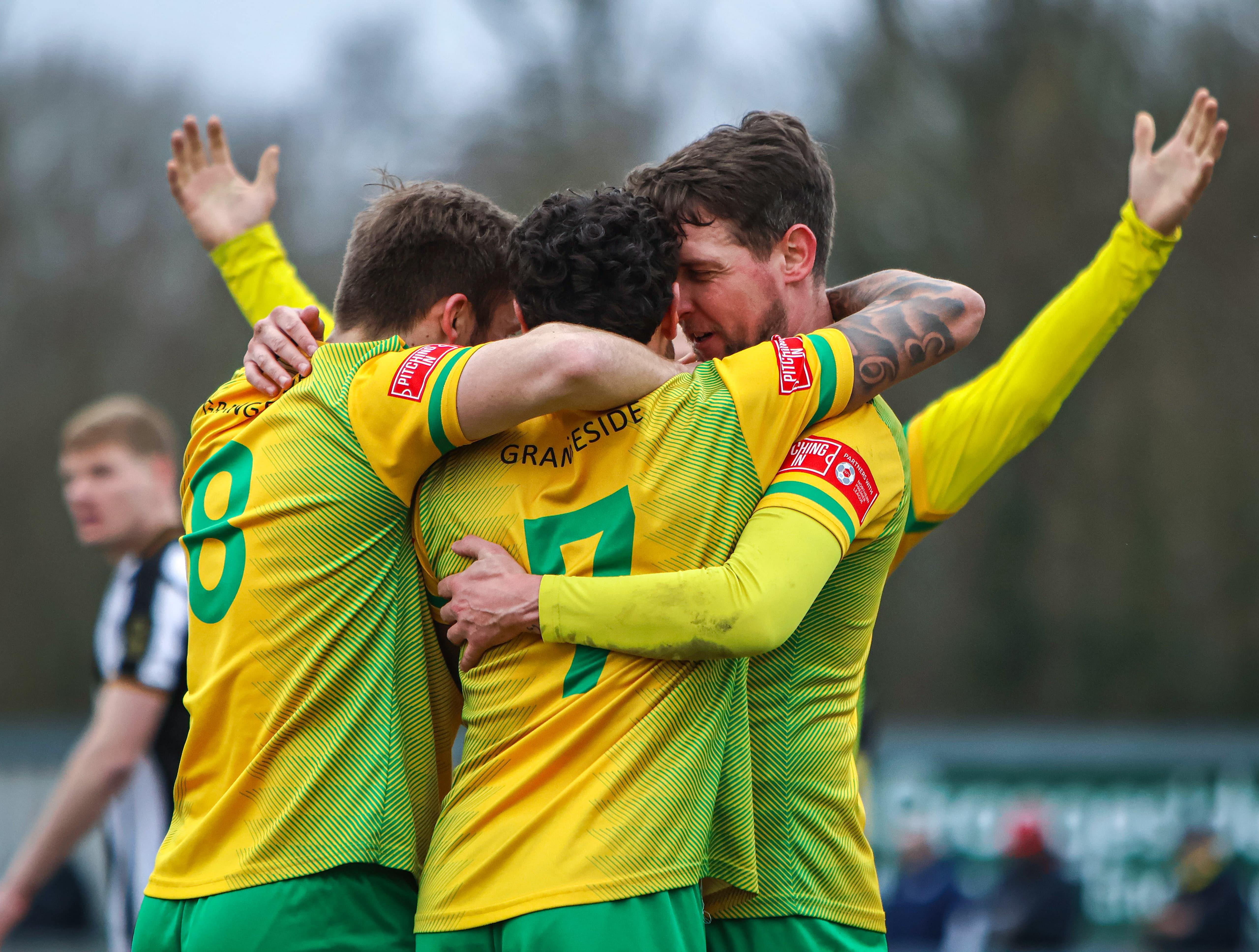 Celebrations continue after Naim Arsan's decisive goal as be is embraced by Lewis Doyle and Ryan Brooke. Picture by Ben Jackson.